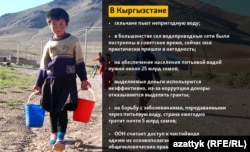 Айнура живет в селе Кызыл-Октябрь в Ошской области. Каждый день она с младшим братом ездит за водой на озеро на своем верном ослике. Все, что дети набирают в пластиковые бутыли, хватит их большой семье лишь до завтра. Вода в озере грязная, но семья вынуждена использовать ее как питьевую, потому что чище этой и более пригодной для питья воды нет во всей округе. Путь до ближайшего источника занимает около часа, и ездить к нему за водой могут позволить себе только те, у кого есть собственный автомобиль.