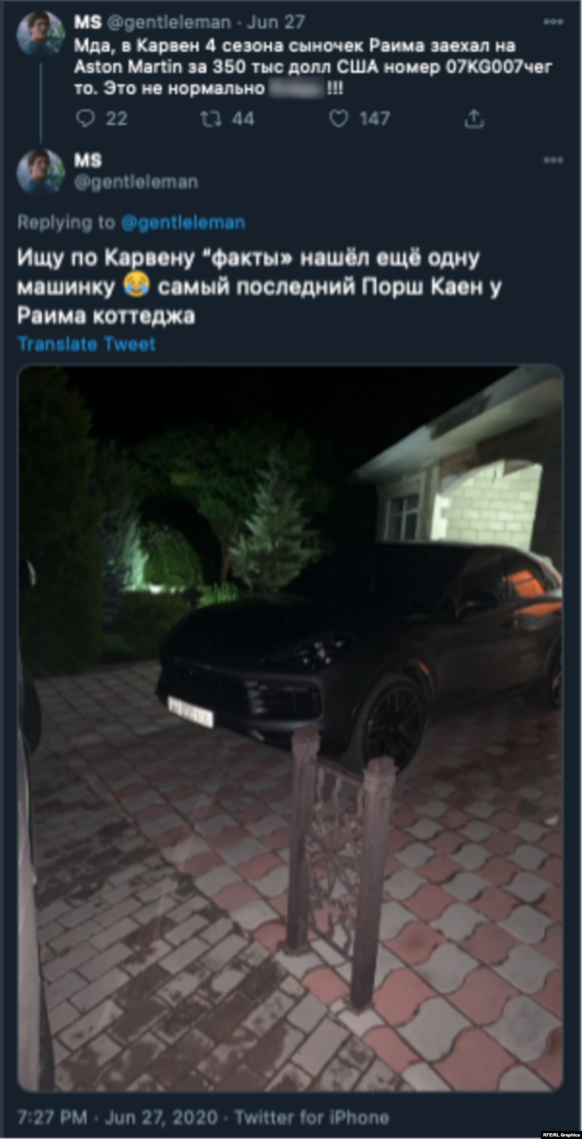 В июне пользователь Twitter написал, что видел на территории курорта сына Матраимова, Бакая, за рулем «Астон Мартин». Также он опубликовал фото автомобиля «Порше Кайен» на подъездной дорожке Матраимовых.