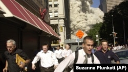 Люди, оказавшиеся в зоне падения обломков башен, спасались бегством.